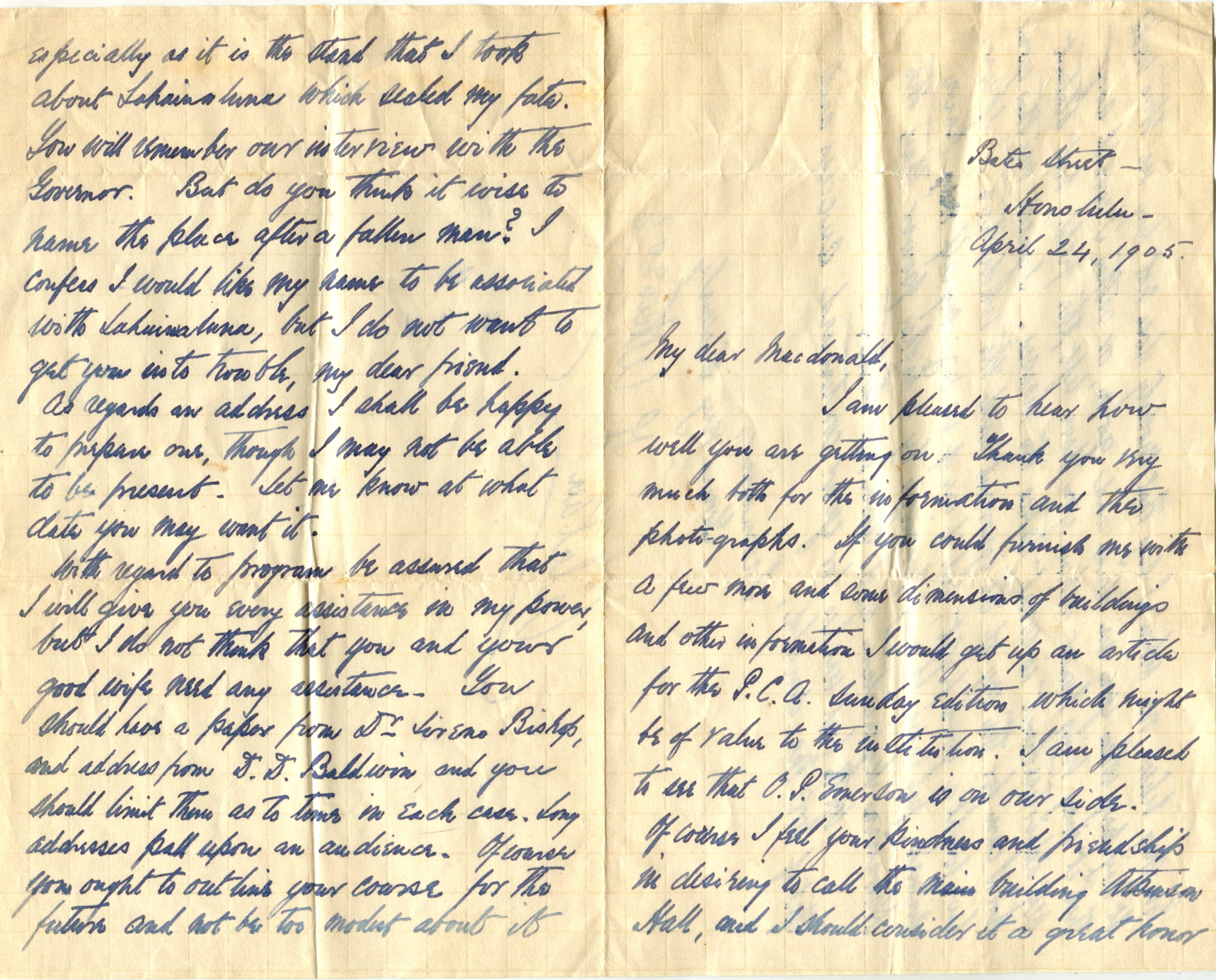 “Of course, I feel your kindness and friendship in desiring to call the main building Atkinson Hall, and I should consider it a great honor, especially as it is the stand that I took about Lahainaluna that sealed my fate. You will remember our interview with the Governor. But do you think it wise to name the place after a fallen man? I confess I would like my name to be associated with Lahainaluna, but I do not want to get you into trouble, my dear friend.”