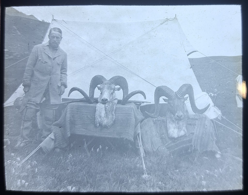 Throughout this journey our traveller was hunting. The slides include his trophies, including ibex, Marco Polo sheep, roedeer, huge Asiatic wapiti or maral (red deer) and, sadly, snow leopards. One of the slides says that his Ovis littledalei had horns that measured 57.5 inches across, which he says was a record. But the real question is who is this person. Can you help? I know that it is not Captain HHP Deasy, who published In Tibet and Chinese Turkestan in 1901. Nor does it appear to be Percy Church, whose In Chinese Turkestan with Caravan and Rifle was published the same year, even though the route was very similar, as were the hunting trophies. However, I am reasonably sure that he is English.