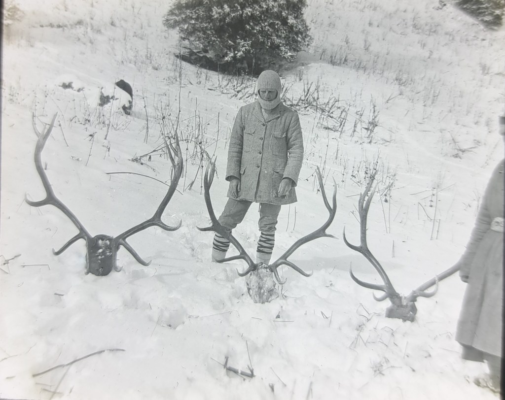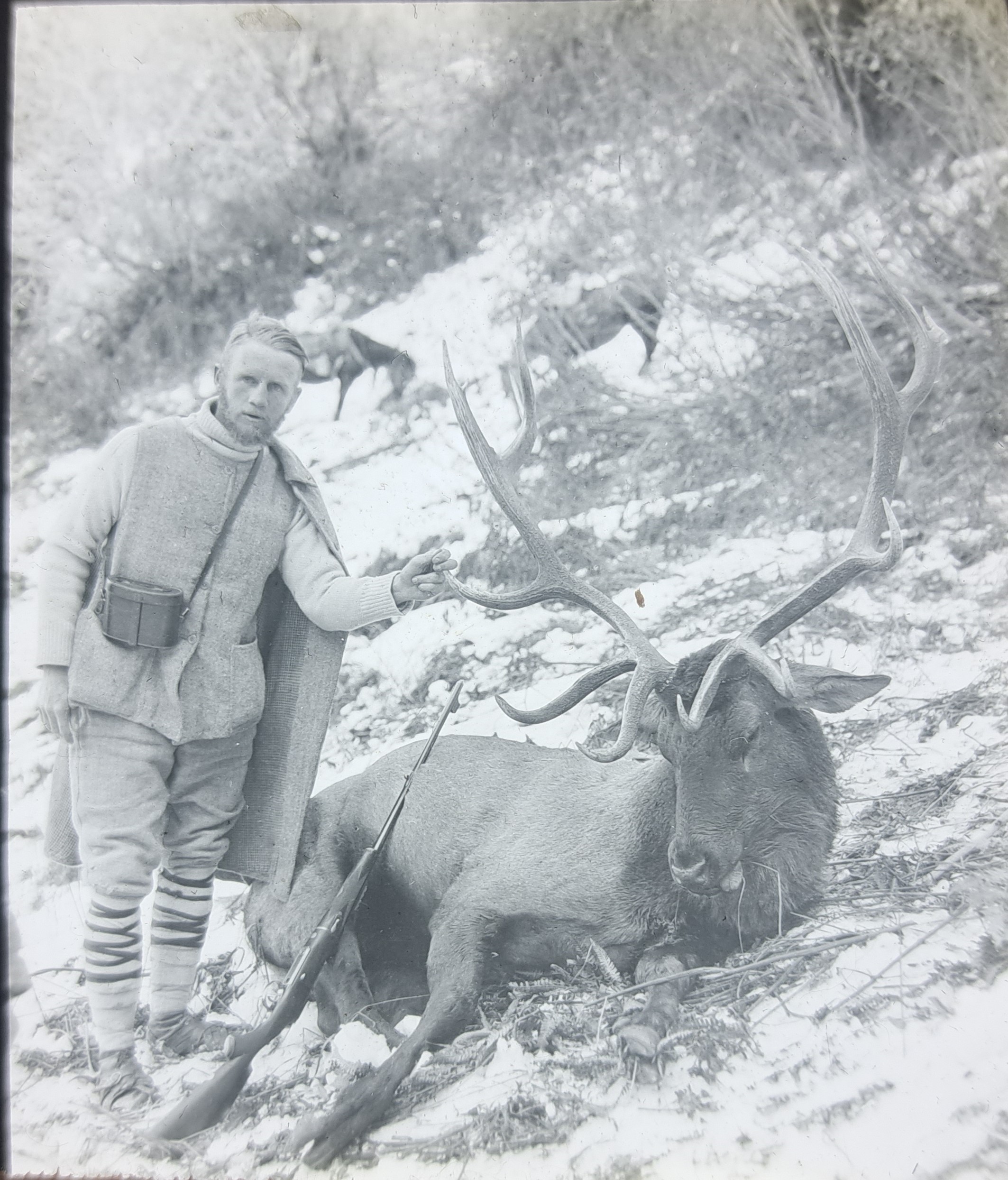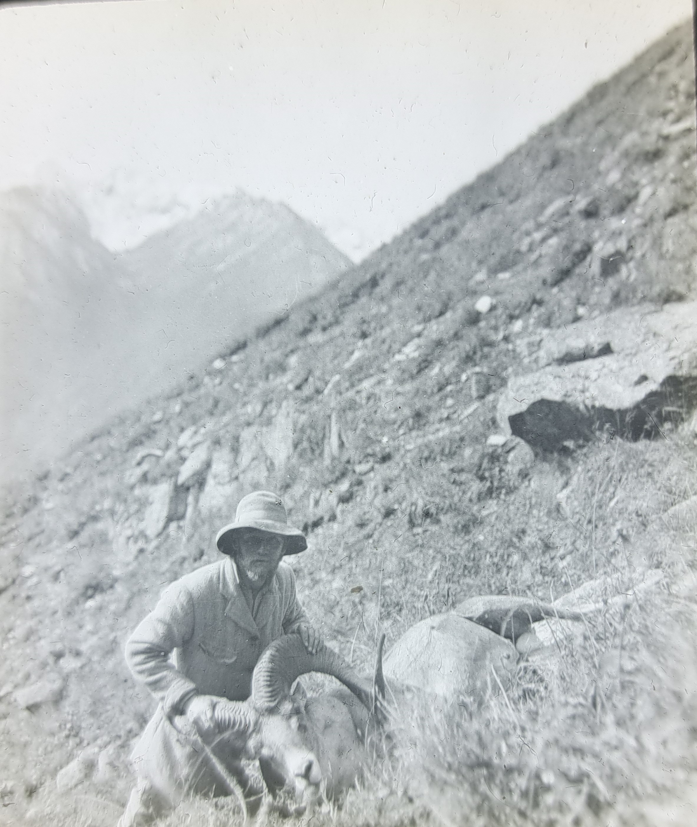 Thank you to those of you who have made suggestions as to the identity of the hunter whose collection of slides I recently obtained. We are getting closer, but I am not yet sure who he may be. I am adding a couple more portraits to see if they may prompt any further suggestions. The first is captioned “After wapiti in the Amba Nullah, Tien Shan“.
