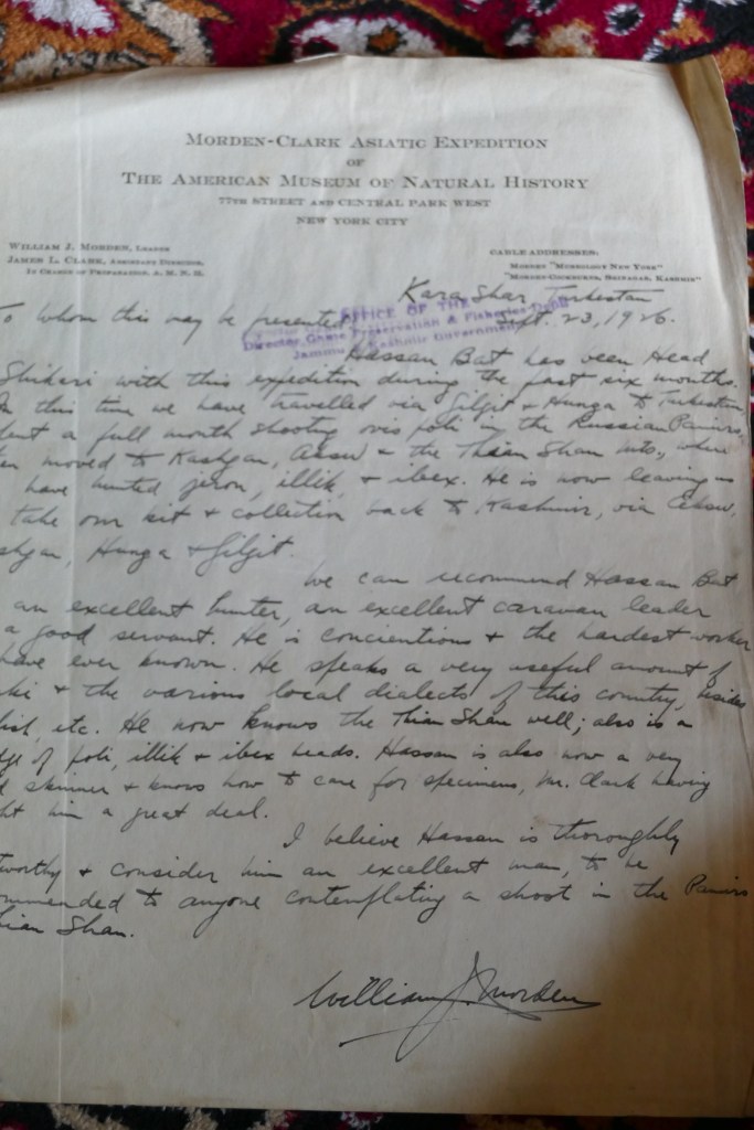 So there you have it. Both Hassan Bhat and Raheem Lone have between them dozens of testimonials from some of the most prominent hunters and specimen collectors in the world. The animals they shot are still on display at museums in Chicago, New York and Philadelphia. Without their skills it is doubtful if their clients could have shot a thing or found their way through the difficult terrain up into Central Asia. Their descendants, whilst no longer supporting the kind of extensive hunting trips that happened in the past, are proud of the achievements of their forbearers, who knew some of the world’s most remote places better than almost anyone else.